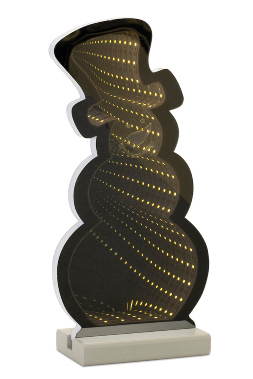 Bring festive magic to your home with this 12" Snowman Infinity Light. Battery-operated and USB compatible (adapter not included), it adds a charming glow to your Christmas tree, mantel, or tabletop. Perfect for creating a whimsical holiday display in any nook, hallway, or entryway.