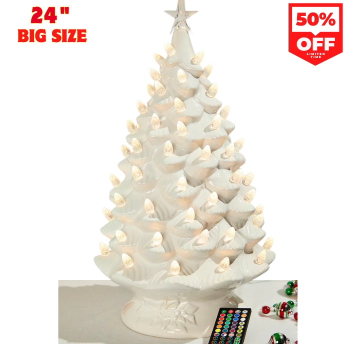 Bring vintage holiday charm with a modern twist to your home with this 24" white ceramic nostalgic tree. Featuring built-in RGB color-changing lights, it adds a cozy glow and festive spirit to any tabletop or mantel display.