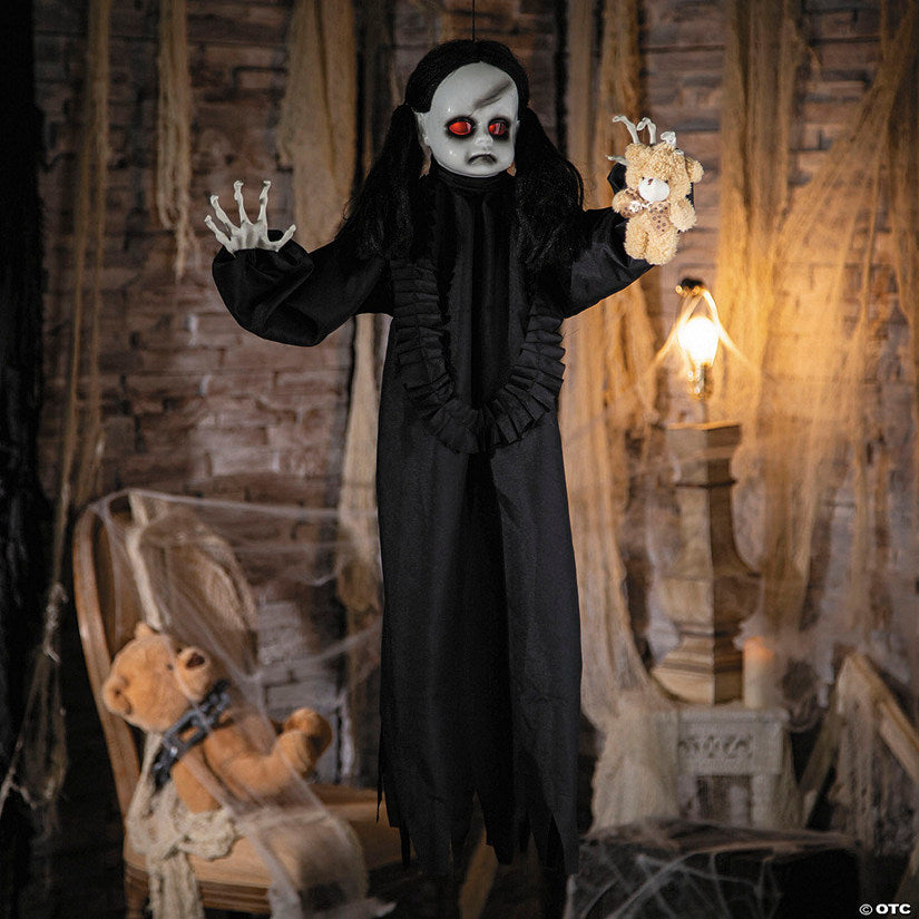 This small hanging decoration features a girl with sunken face and black hair wearing a long, tattered dress and clutching a brown, stuffed bear.SPOOKY DESIGN: With bony fingers, gaping mouth and eerie red eyes, this girl dressed all in black is an eye-catching addition to Halloween displays.HANGING DECORATION: This girl is designed to hang and will appear to float eerily in the breeze.VERSATILE USE: Whether you enhance your yard display, porch decorations or indoor party decorations, this hanging girl is a great addition to your Halloween haunt.Product Description:Spooking passersby, trick-or-treaters or party guests is this girl's favorite Halloween activity. The hanging decoration features tattered black clothing covering her bony figure along with eerie red eyes and a disheveled stuffed bear clutched in her hand. Enhance your haunted house setup, party decorations or yard display with this spooky girl. Requires 3 AAA batteries, included.Size: 31 1/2"Quantity: 1Material: Polyester.