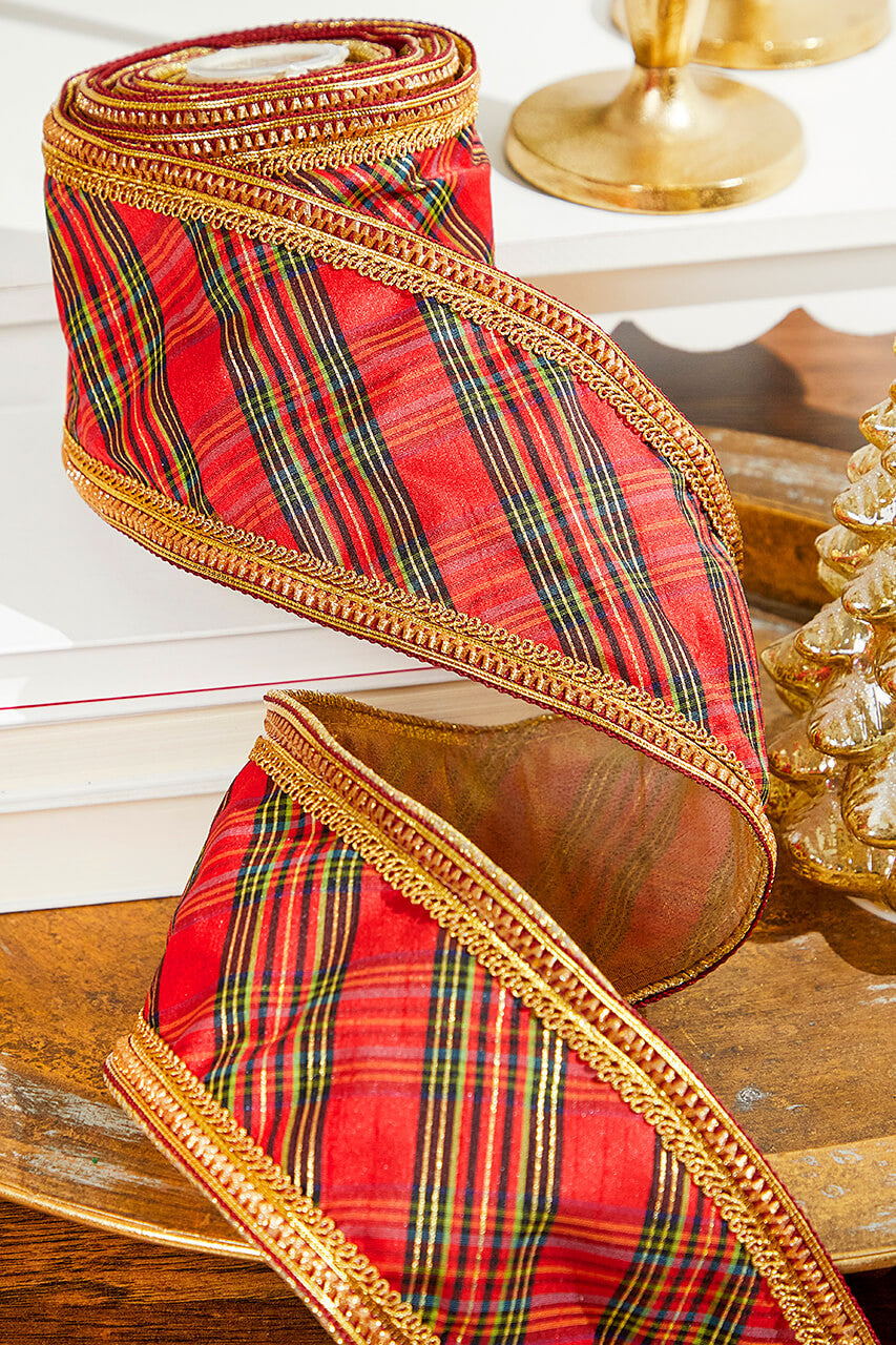 - Add a festive touch to your holiday décor with this 4" x 5 Yard Red Tartan Plaid Wired Ribbon with Trim. Featuring a traditional tartan pattern with wired edges and decorative trim, this ribbon is perfect for bows, wreaths, gift wrapping, and seasonal crafts.