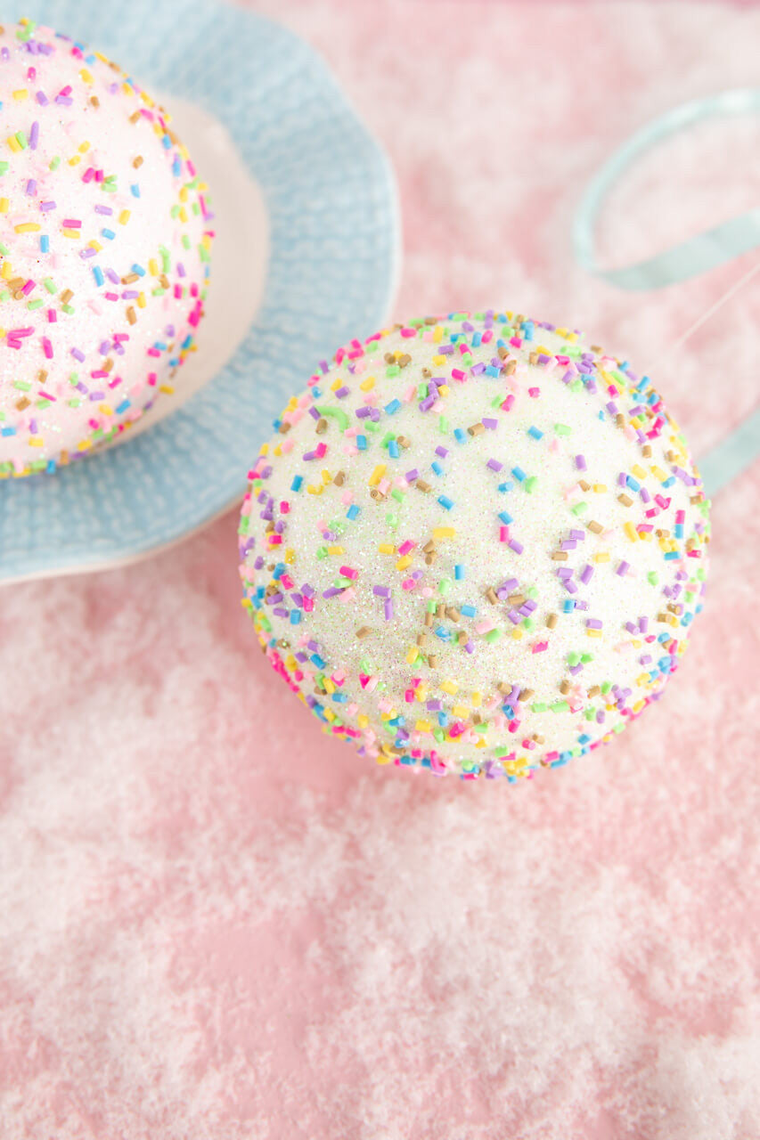 - Add a playful, sweet touch to your holiday décor with this 4-inch Green Sprinkles Ball Ornament. Featuring a vibrant green base adorned with colorful rainbow sprinkles, this ornament is perfect for creating a Santa’s Sweet Shoppe–inspired Christmas tree. Ideal for mixing with pastel-themed decorations, ribbons, and sprays, it brings whimsical charm and festive cheer to any display.