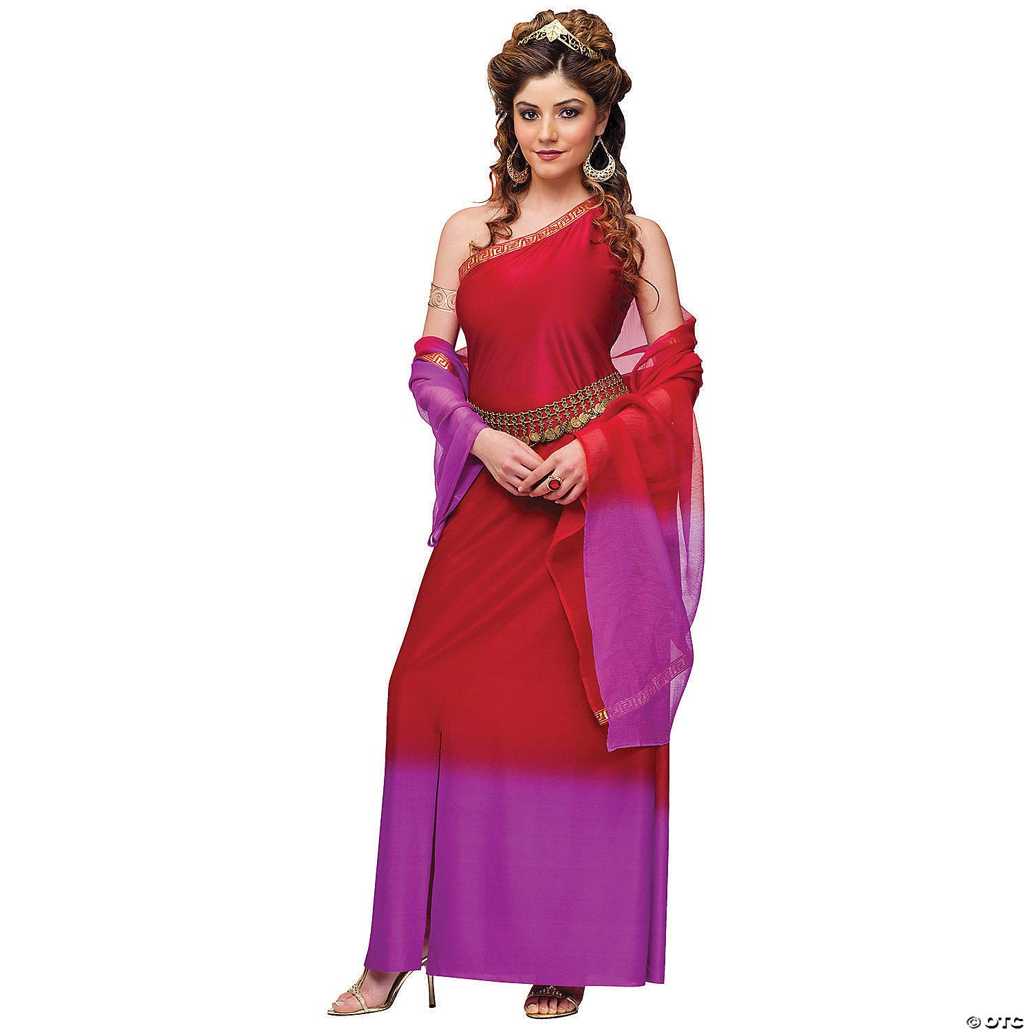A Roman goddess is a picture of both strength and beauty. Her beguiling swagger, not just her amazing looks, determined the fate of men. This fine Halloween costume idea, the Roman Goddess costume for women will set the mood for you this year. Supernatural elegance is captured in this costume which includes a polyester single-shoulder red and purple gown, golden arm cuffs and an ornate headband. Add your own authentic hairstyle, lace shoes and royal grace to make this a stunning outfit. THis Halloween, throw away the white toga and dress up in a truly imperial design as homage to the powerful goddesses of yore.Includes:• Graceful one-shoulder gown has golden embroidered trim• golden arm cuff• Laurel leaf headband. Imported.