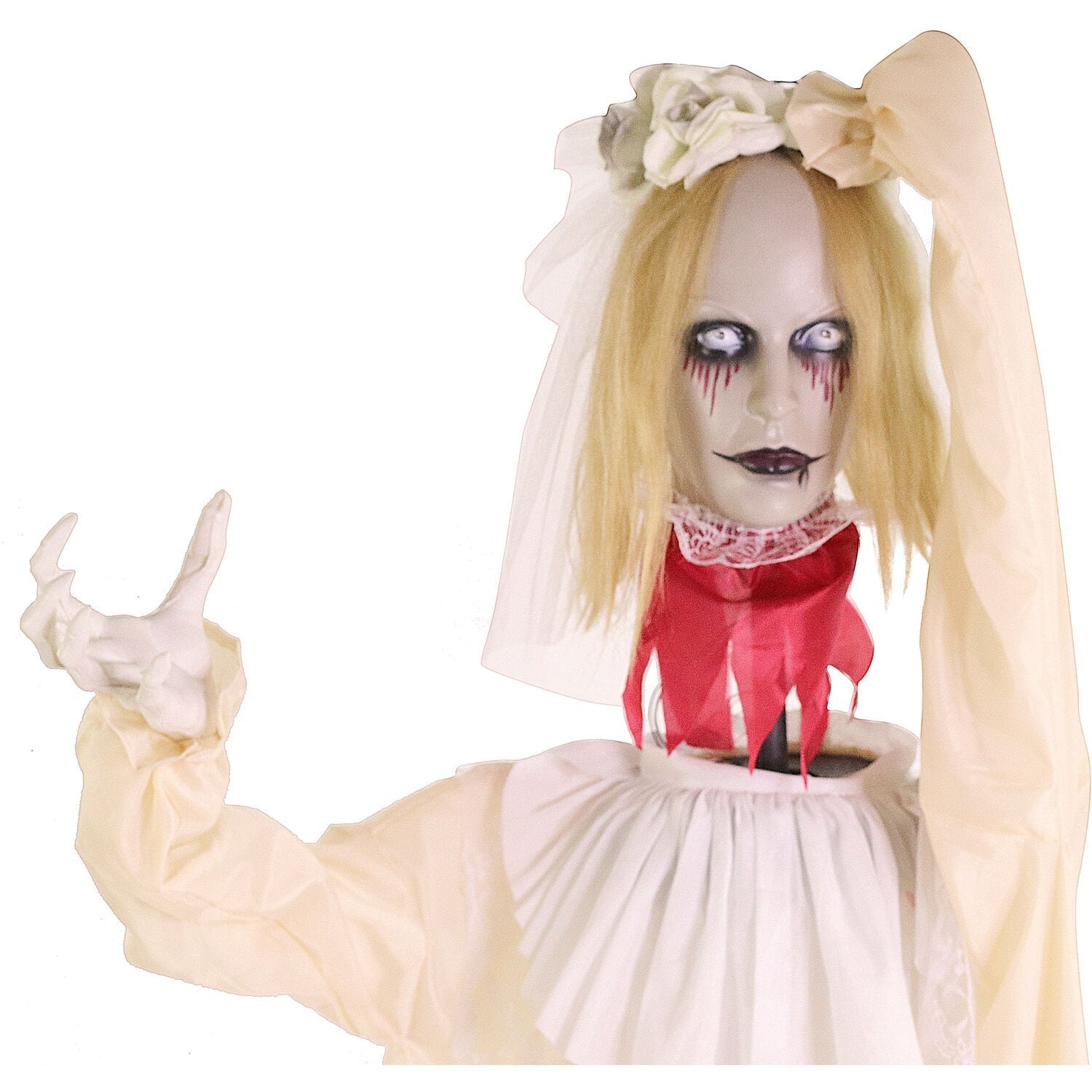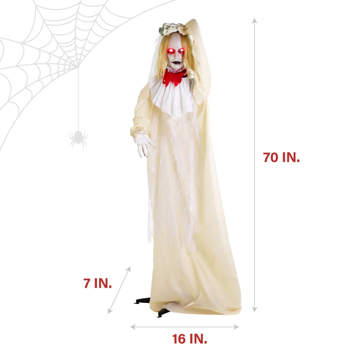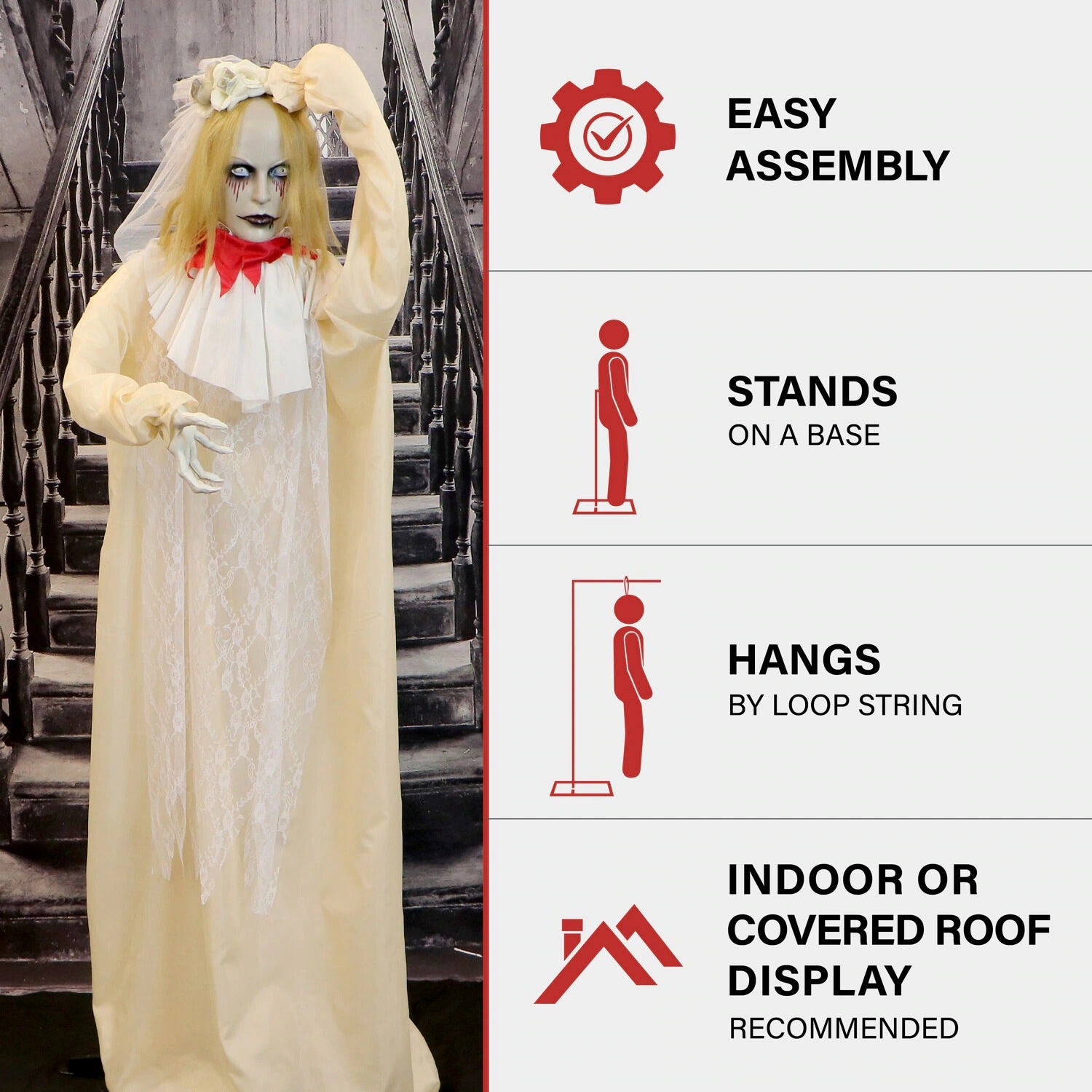 Spook your Halloween guests with the 5.8-ft Freestanding Talking Lighted Poppy Zombie Animatronic from Haunted Hill Farm. Featuring glowing eyes, talking phrases, and realistic zombie movements, this large animatronic is ideal for indoor or covered outdoor displays, bringing a thrilling scare to your haunted setup.