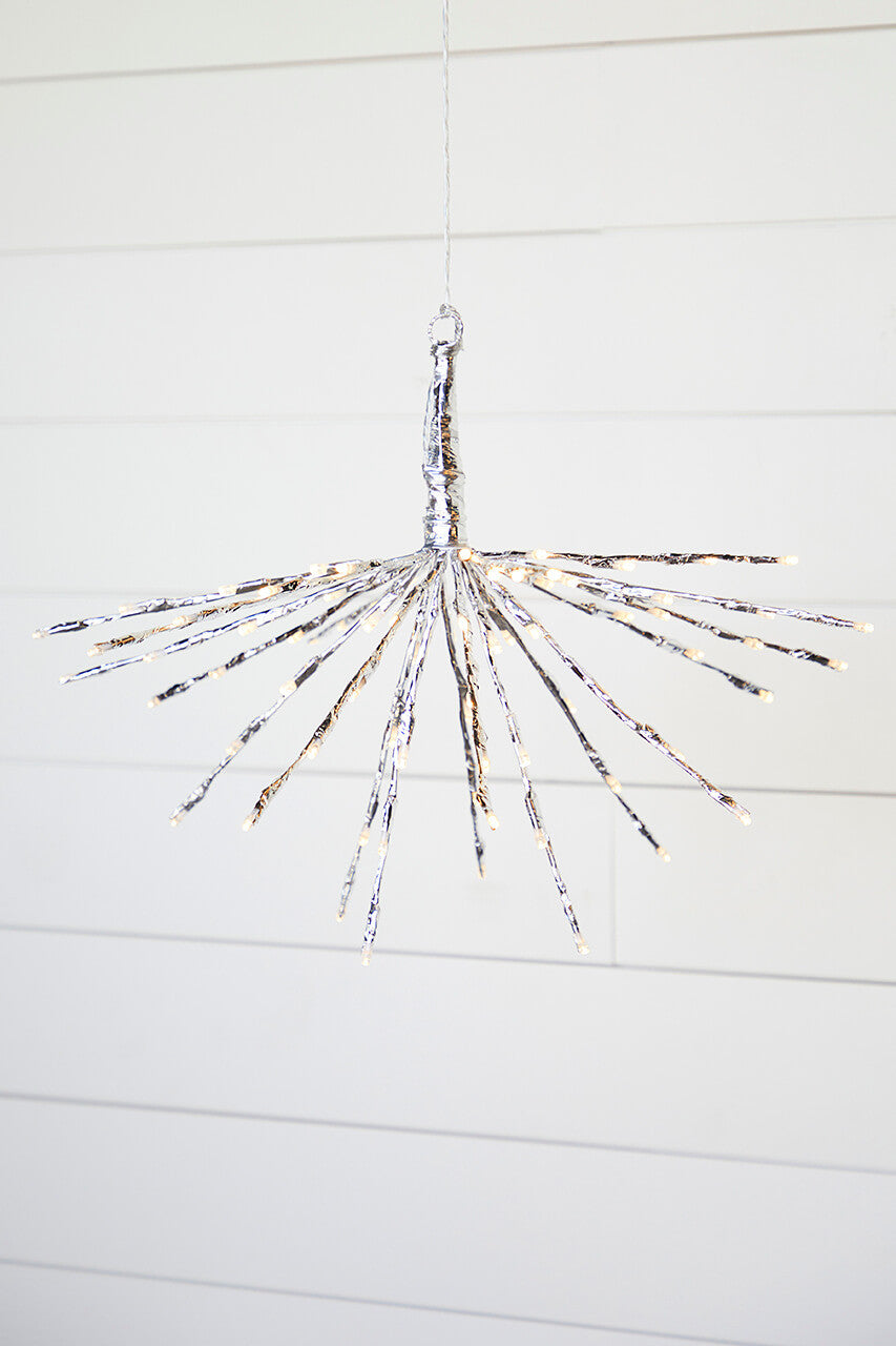 Create a stunning festive focal point with the LED Umbrella Display featuring 80 warm white lights. Measuring 18 inches in diameter, this elegant display adds brilliance to both indoor and outdoor settings. Its silver strand design and five lighting modes—one steady and four flow speeds—offer versatile illumination options. Perfect as a captivating hanging display or as a dazzling Christmas tree topper, it brings elegance and charm to your holiday décor.