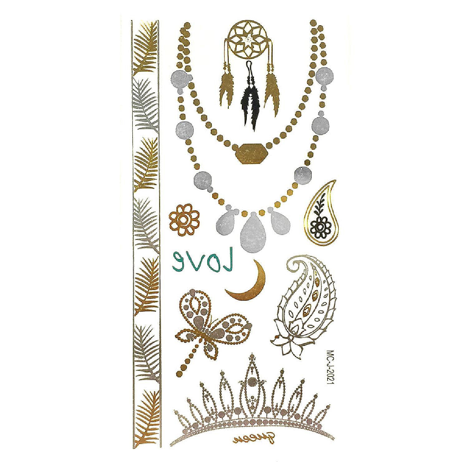 Decorate your body with these exotic temporary tattoos that are inspired by celebrities. These tattoos come in shimmery gold, silver, and black colors in a number of designs and patterns. They can be worn in place of jewelry at the beach / poolside, while clubbing, or to special events. How to apply: 1. Cut out the tattoo you want to use and remove the transparent film. 2. Place the tattoo face down on your skin. 3. Wet the tattoo thoroughly with a sponge or damp cloth. 4. Peel the paper gently to see if it transferred (about 30 seconds). If not, press down and wet again. 5. Gently remove the paper and allow the tattoo to dry. To remove: Rub with cold cream, baby oil, makeup remover, or alcohol.Make a statement with these celebrity inspired temporary tattoos in metallic gold, silver, and black.Wear these tattoos in place of jewelry. Great for at the beach / poolside, clubbing, or special events.Available in numerous designs and patterns.Dimensions: Medium 9.25 x 4 inchesEasy to apply, just use water.