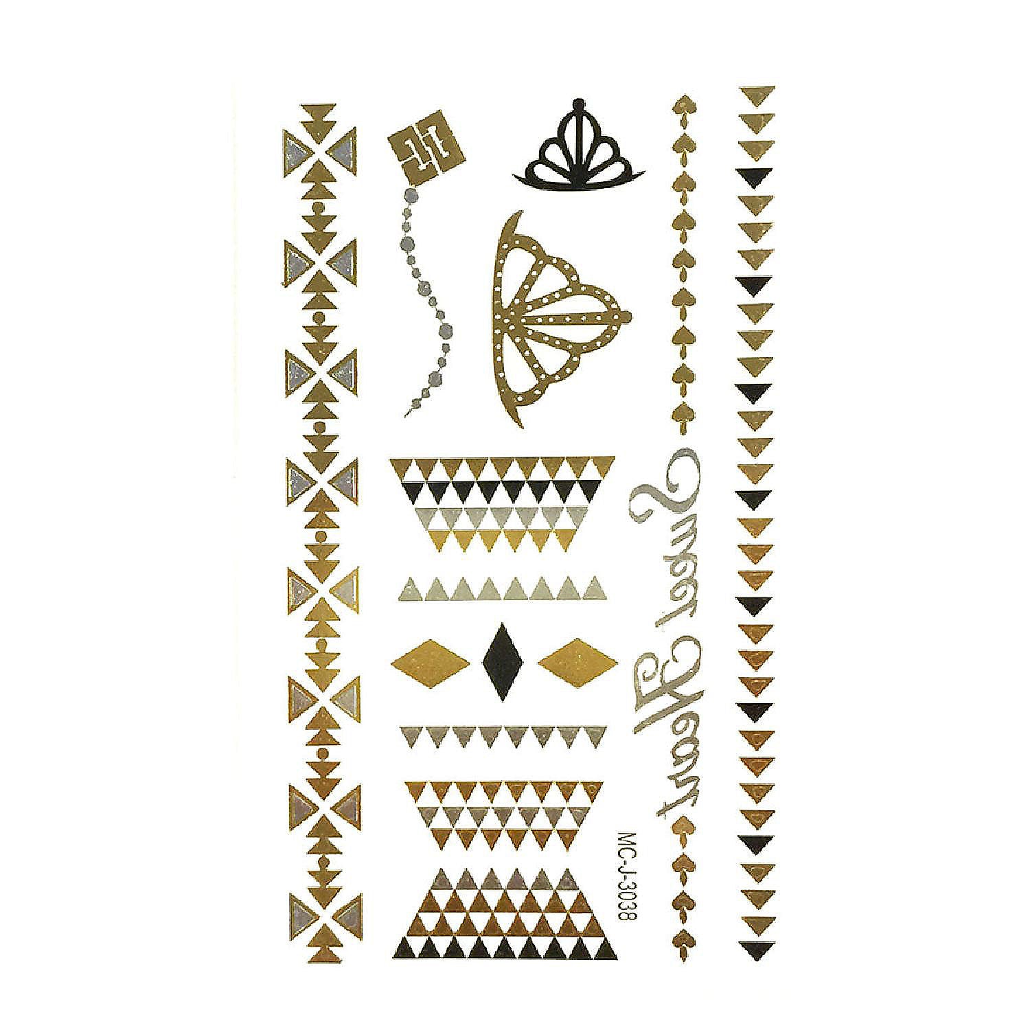 Decorate your body with these exotic temporary tattoos that are inspired by celebrities. These tattoos come in shimmery gold, silver, and black colors in a number of designs and patterns. They can be worn in place of jewelry at the beach / poolside, while clubbing, or to special events. How to apply: 1. Cut out the tattoo you want to use and remove the transparent film. 2. Place the tattoo face down on your skin. 3. Wet the tattoo thoroughly with a sponge or damp cloth. 4. Peel the paper gently to see if it transferred (about 30 seconds). If not, press down and wet again. 5. Gently remove the paper and allow the tattoo to dry. To remove: Rub with cold cream, baby oil, makeup remover, or alcohol.Make a statement with these celebrity inspired temporary tattoos in metallic gold, silver, and black.Wear these tattoos in place of jewelry. Great for at the beach / poolside, clubbing, or special events.Available in numerous designs and patterns.Dimensions: Small 7.5 x 3.75 inchesEasy to apply, just use water.